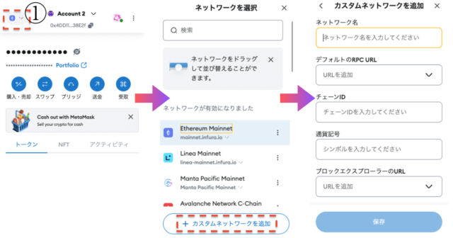 ネットワーク名:Base 新しいRPC URL:https://mainnet.base.org チェーンID:8453 通貨シンボル:ETH ブロックエクスプローラー:https://basescan.org