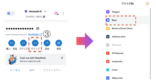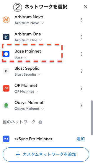 出典:メタマスク - ネットワーク一覧から「Base Mainnet」を選択
