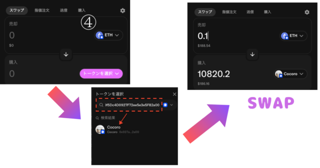 - Uniswapのスワップ画面で、売却(From)にBaseETH、購入(To)にCocoroを設定