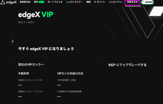 自身のVIPランクや手数料は、画面右上の「詳細」→「VIP」より確認できます。