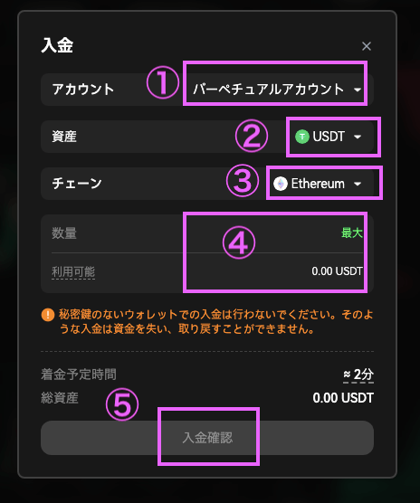 また、入金自体にedgeXの手数料はかかりませんが、ウォレットから送金する際には利用するネットワークのガス代が必要です。 イーサリアムやアービトラムから入金する場合はETHが必要です。