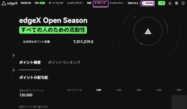edgeX では、ユーザーの取引状況や参加状況を確認できるダッシュボードが用意されています。「ポイント」「$MARU」のページにそれぞれのダッシュボードと成績が表示されています。