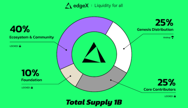 edgeXでは独自トークンの発行が予定されており、公式ロードマップではTGE(トークン発行イベント)が計画されています。トークノミクスによると、エアドロップにはトークン総供給量の25%が割り当てられています。