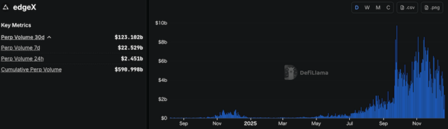 edgeX(エッジエックス)は、中央集権型取引所(CEX)並みの使いやすさで永久先物取引ができる分散型取引所(DEX)です。公式サイトによると、累計取引ボリュームは5,900億ドルを超え、永久先物DEX市場でトップクラスの存在感を示しています。