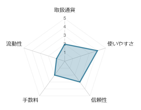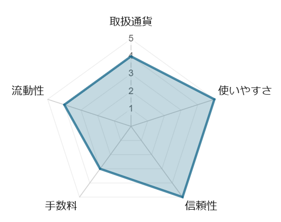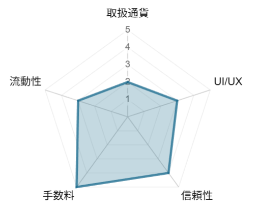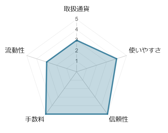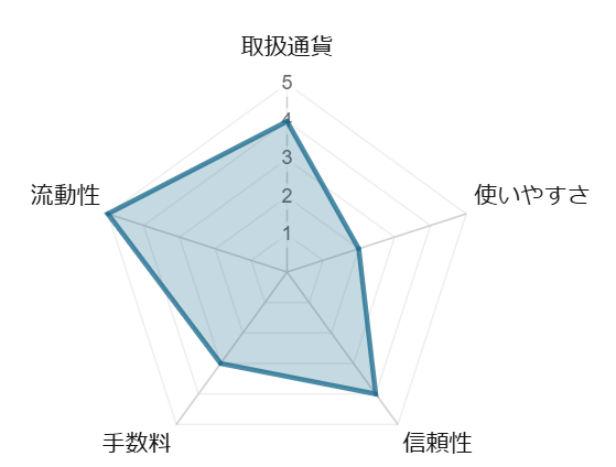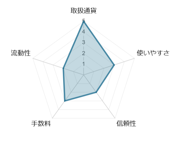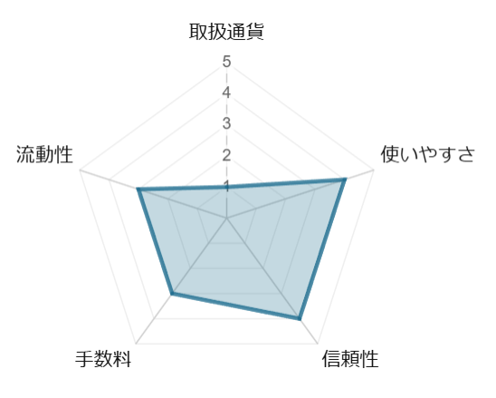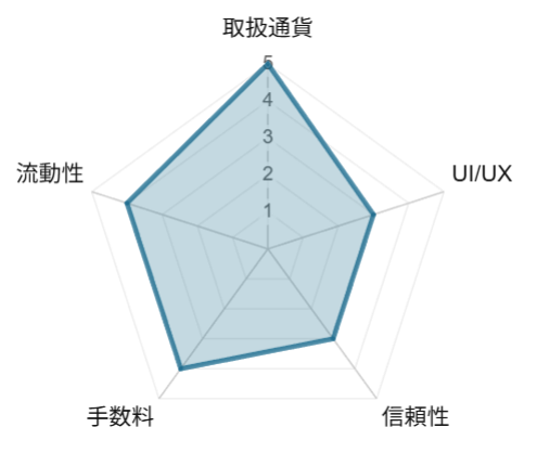 以下では、各取引所の特徴を詳しく紹介します。評価基準は取扱い通貨数、使いやすさ、信頼性、手数料、流動性の5項目で、それぞれ5点満点のレーダーチャートで比較しています。