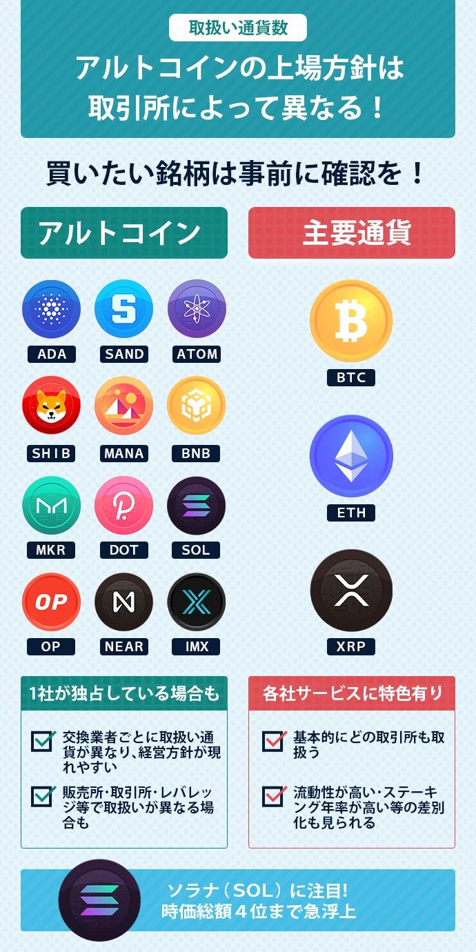 各取引所では、扱っている仮想通貨の種類や銘柄が異なります。