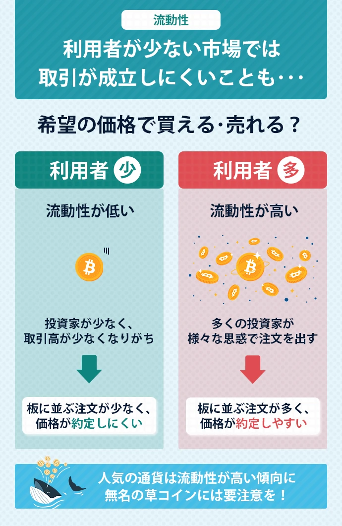 取引所のユーザー数や銘柄の流通規模が流動性に影響します。例えば、ビットコインやイーサリアムのように時価総額が大きい通貨は流動性が高い一方で、新興の「草コイン」は流動性が低く、価格変動リスクが高いです。
