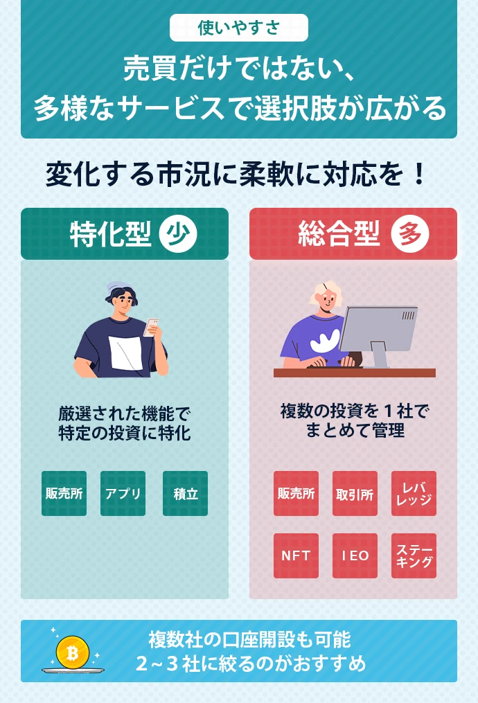 例えば、手軽にビットコインを購入したい場合や、スマートフォンアプリを通じていつでも迅速にトレーディングを行いたい場合、またはステーキングやレンディングなどの運用を管理したい場合など、利用シナリオに応じた機能性が求められます。