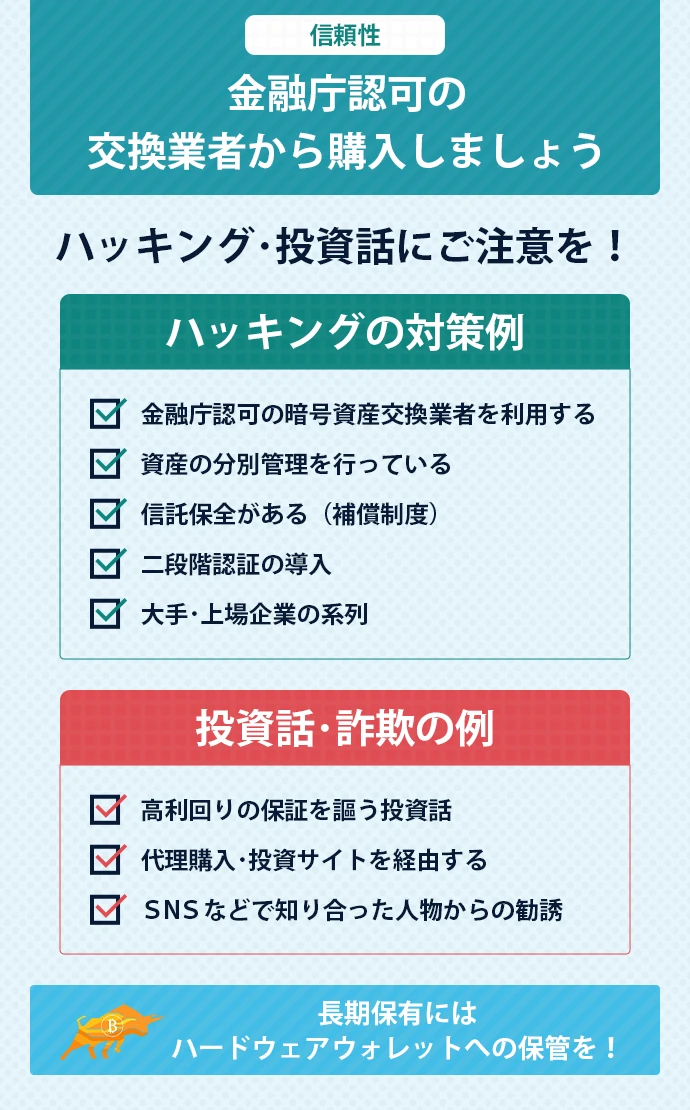 取引所を選ぶ際には、顧客資産をインターネットから隔離されたコールドウォレット(オフライン環境)で管理しているか、サイバー攻撃への対策が十分に行われているかなどを確認しましょう。