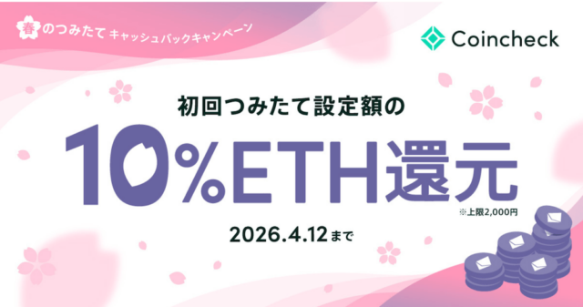 | 春のつみたてキャッシュバックキャンペーン〜初回つみたて設定額の10%相当のETHをプレゼント(上限2,000円) | 最大2,000円相当 | 〜4/12 |