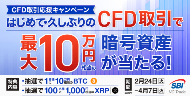 CFD取引応援キャンペーン〜はじめて・久しぶりのCFD取引で最大10万円相当の暗号資産が当たる!