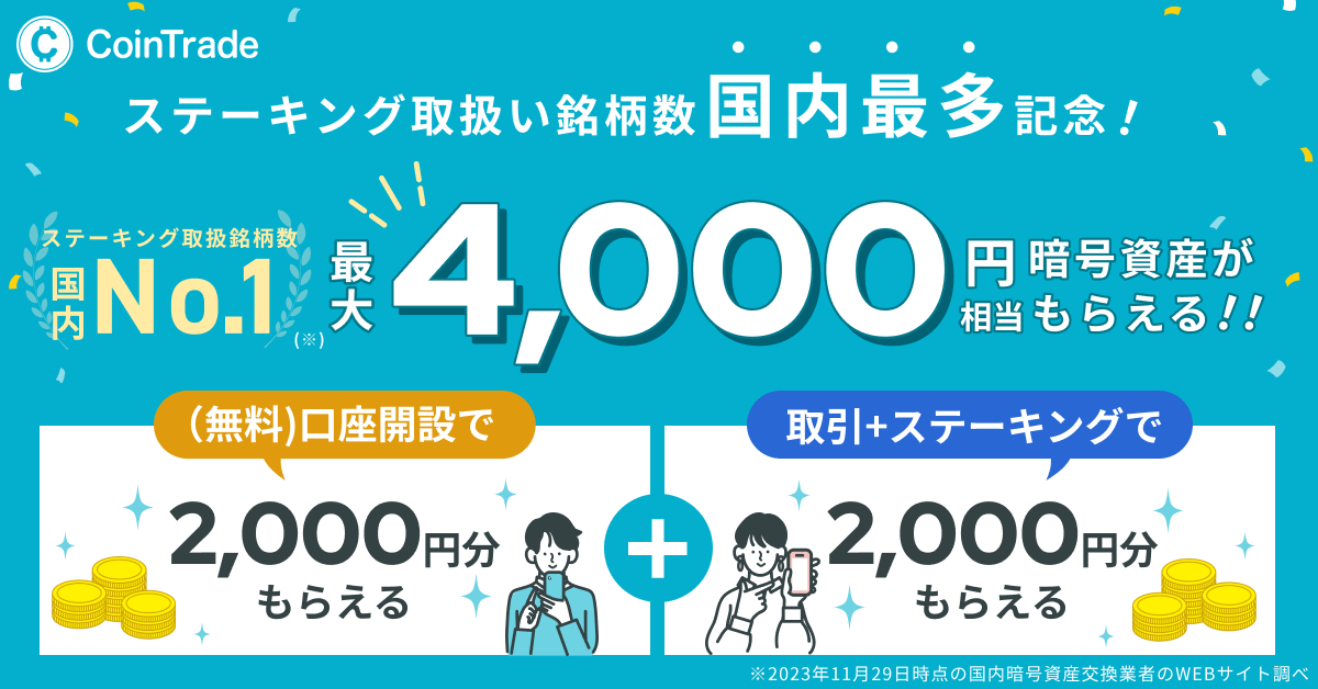 2023年12月17日までに、コイントレードの公式ウェブサイトから新規口座開設を完了し、条件を満たすと、合計で最大4,000円相当の暗号資産を受け取ることができます。