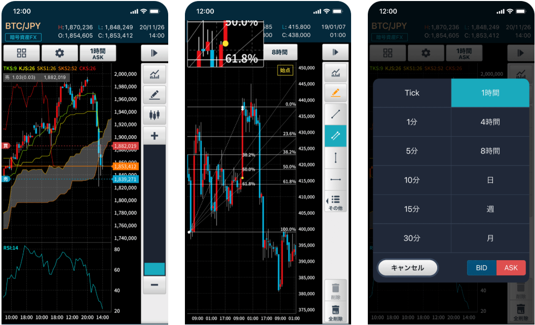 GMOコインのアプリは、外国為替FXで培ったノウハウを活かした高機能チャートを搭載。価格アラートやウィジェット機能を備えた「トレーダーモード」は、経験者を中心に高い評価を得ています。さらに、暗号資産FXではワンタップで発注可能なスピード注文機能を搭載しており、市場の急変にも素早く対応できます。