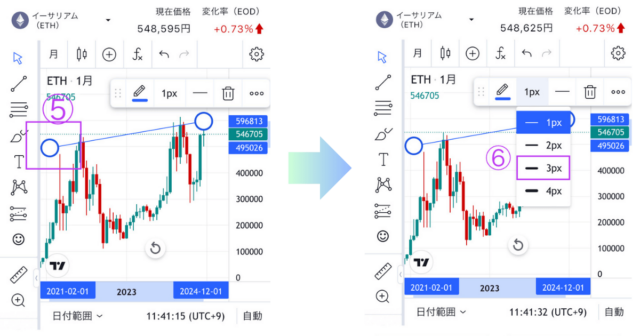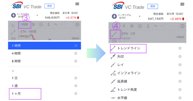 ③月足を選択し④描画ツールの1番上のアイコンをタップして、トレンドラインを選択する。