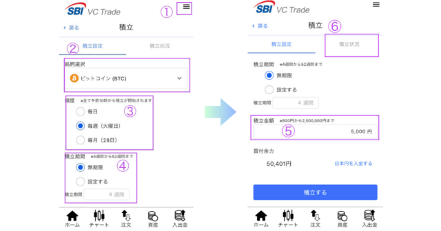 ⑤一回あたりの積立金額を入力し「積立する」をタップ。