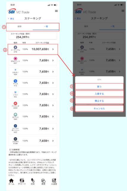 ステーキング画面も旧アプリにはなかった機能です。 SBI VCトレードでは対象銘柄を保有するだけで自動的にステーキングが行われる仕組みになっています。