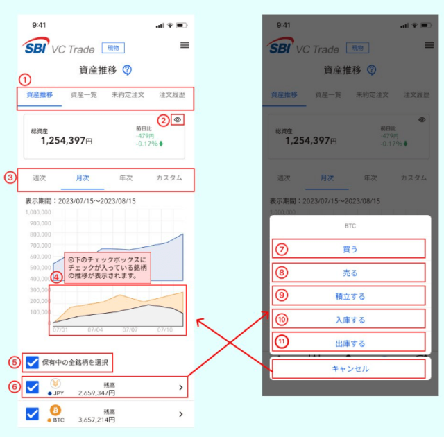 各コインをタップすると、⑦-⑪の複数の選択肢が表示され、売買ページや入出金ページ等に遷移できます。