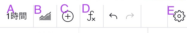 A :時間足の選択 B :値動きの表示方法の選択(ろうそく足やバーに変更可能) C :比較したい銘柄を追加できる D :インジケーターの追加(指数移動平均線やMACDなど、トレード分析ツールが追加できる) E :背景や文字の色や、スケールの値を変更できます。 |