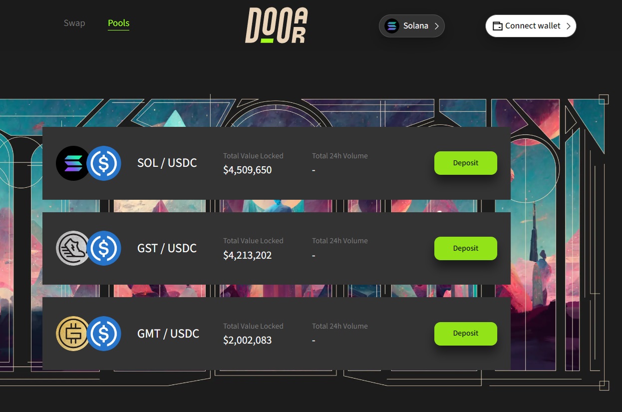 特に、DOOARのソラナ版では「SOL/USDC」、「GSD/USDC」、「GMT/USDC」といった流動性プールを提供しており、他のブロックチェーンと比較して仮想通貨の総残高(TVL)が最も大きい。そのため、SOLからGMTへの交換を最も効率的に行うことができます。
