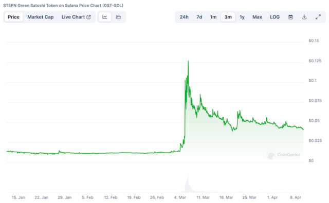 また、STEPNで使用されている暗号資産(仮想通貨)「グリーン・サトシ・トークン(GST)」は、今年3月に入り価格が急騰。以下の画像は過去3カ月間のGST価格のチャートです。