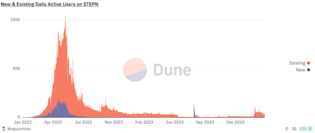 STEPNの各データは「Dune」で見ることが可能です。1日ごとのアクティブユーザー数の推移は以下の通りで、赤のグラフ(Existing)が既存のユーザー、青のグラフ(New)が新規のユーザーを示しています。