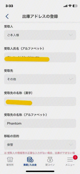 ・ウォレットアドレス: 直接入力、QRコードの読み取り、またはPhantom上のコピーボタンから、アドレスを入力。 ・受取人情報: 「ご本人様」または「ご本人様以外」を選択し、必要な情報(氏名、場合によっては住所も)を入力。