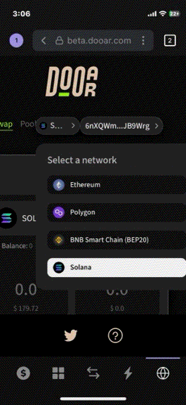 SOLをウォレットに保有していれば、ソラナ・ブロックチェーン上のDOOARとのやり取りが可能となります。Phantomウォレットのウェブアイコンをタップし、検索機能を使用してDOOARにアクセスしてください。