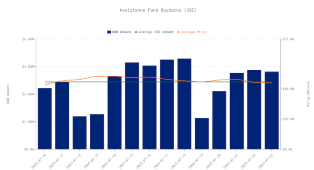ハイパーリキッドでは、取引手数料の多くがプロトコルの収益として蓄積され、累計手数料収益は8億ドルを超えます。その収益の大部分をHYPEの買い戻しに自動的に充てられる設計となっています。公式ホワイトペーパーによると、この買い戻しは、プロトコル内の「アシスタンスファンド」を通じて実行され、HYPEを市場から継続的に回収しています。
