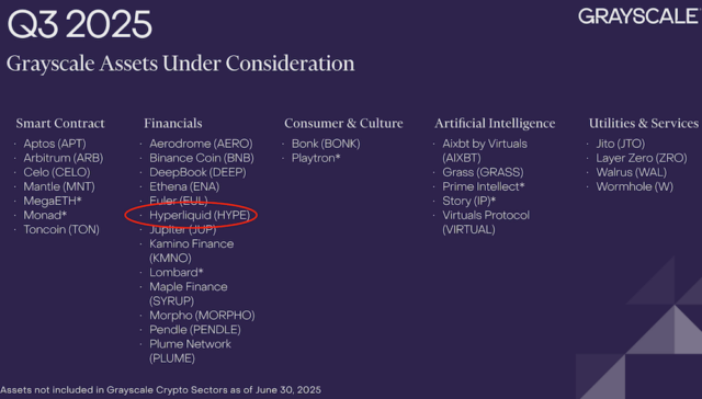 米大手暗号資産運用会社Grayscale(グレースケール)は、2025年12月時点でHYPEを「検討対象資産(Assets Under Consideration)」のリストに加えています。同社はビットコインやイーサリアムの投資信託で知られており、このリストは将来的に機関投資家向けの信託商品として採用する可能性がある銘柄群です。