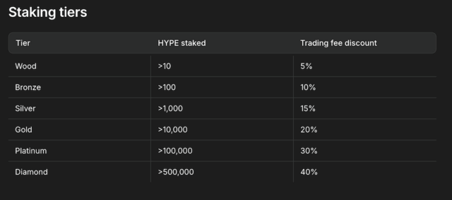また、HYPEをステーキングすることで、ハイパーリキッドでの取引手数料の5%〜最大40%のディスカウントを受けることができる特典が用意されています。これは、単なる年利や報酬といったインセンティブにとどまらず、「取引コストの削減」という実用的なメリットにも直結する設計になっています。