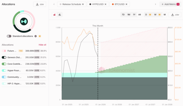 HYPEは総発行上限10億枚のうち、現在流通しているのはおよそ3.8億枚です。2025年11月以降、運営側の保有分が段階的にアンロックされていくなど、市場に追加供給されることが価格に影響を与える可能性があります。