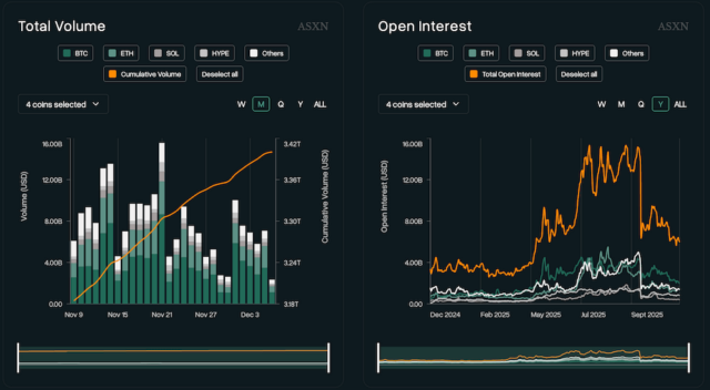 2025年12月時点での累計取引量は3.4兆ドルを突破、未決済建玉(OI)は60億ドル前後を推移し、分散型取引所としては特出したスケールを誇ります。トータルユーザーは88万人、デイリーアクティブトレーダーは5万人を超える日もあり、日々活発な取引が行われています。