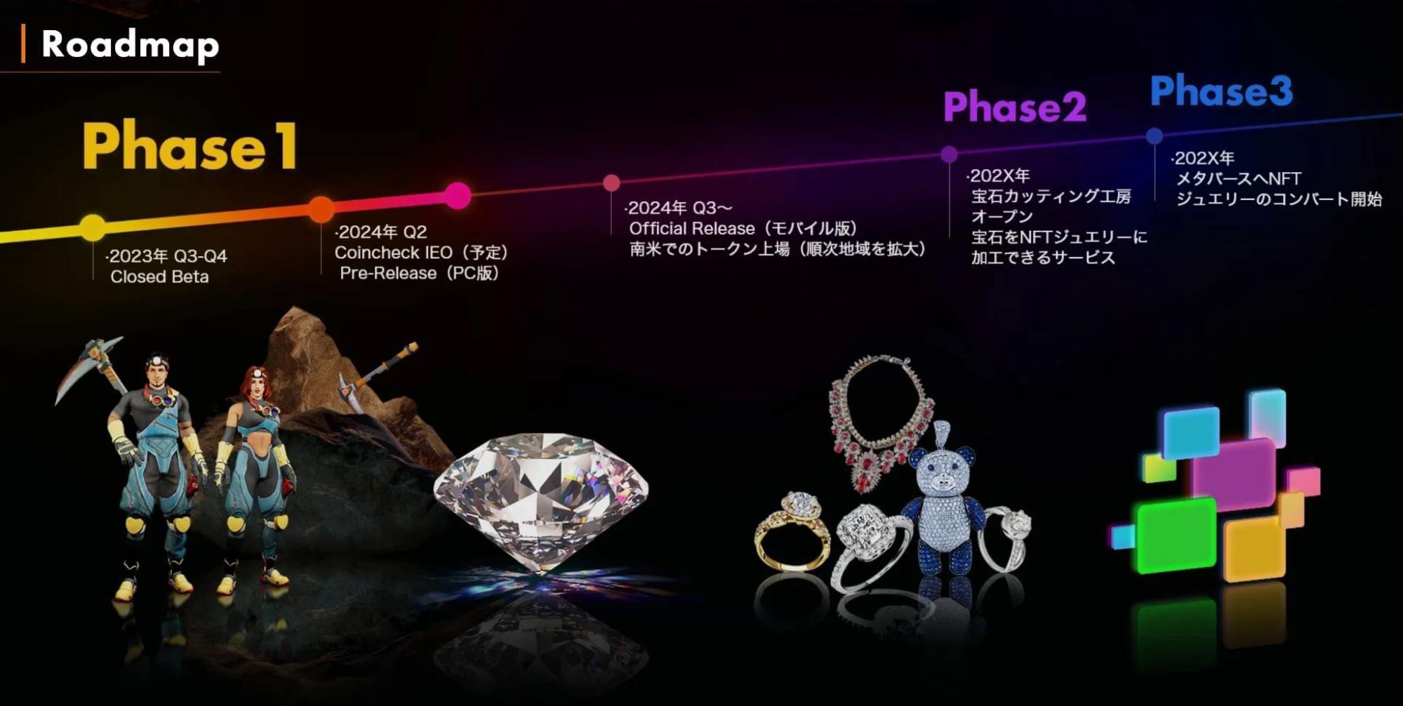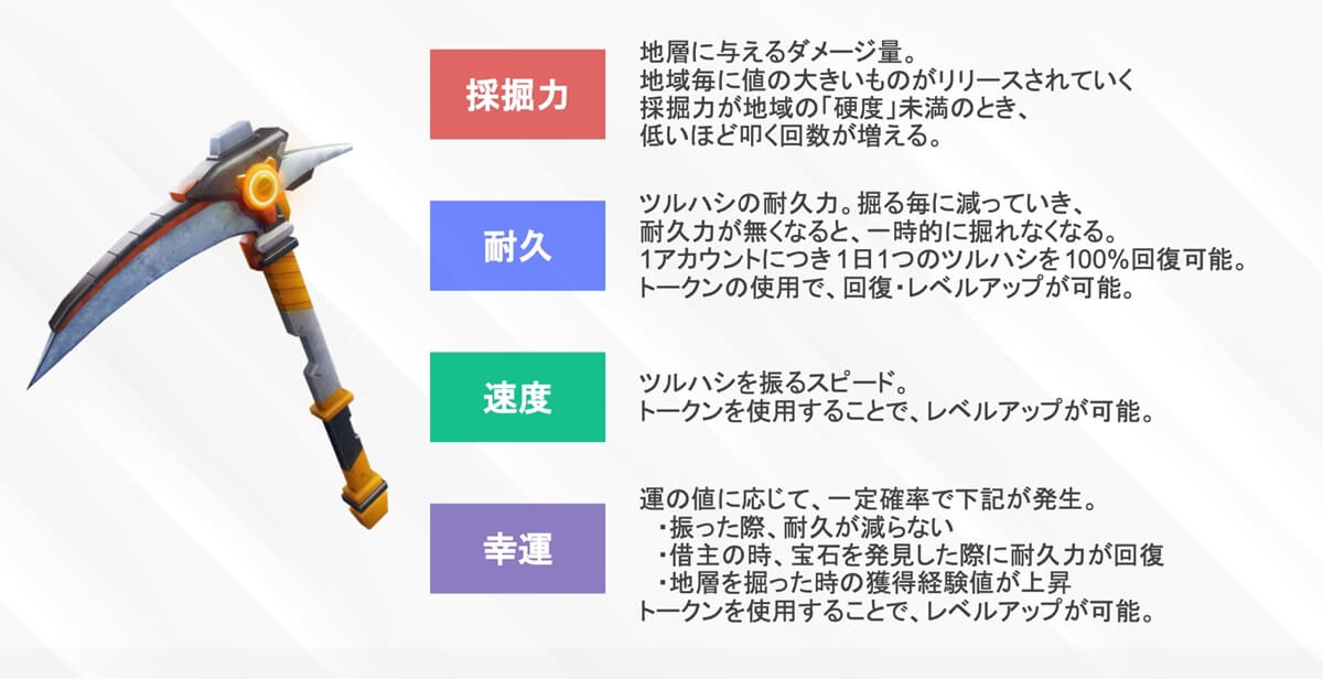 つるはしNFTは採掘スピードや運といったパラメーターを高めるため、ゲーム内で重要な役割を果たします。採掘によって獲得できるデジタル世界の宝石NFTは、ダイヤモンド、レッドスピネル、アクアマリンの3種類があり、カラットやクオリティ等によって希少性が変わります