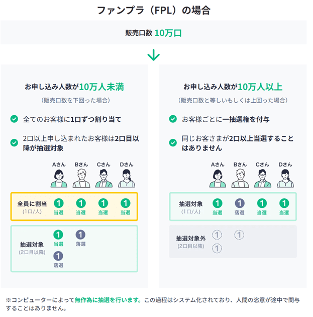 【11月13日更新】 FPLの応募総額は90.6億円、申込口座数は28,523口座、抽選倍率は9.06倍だった。販売総数10万口に対し申込口座数が下回り、申込者全員に最低1口(1万円)が確定配分される結果となった。