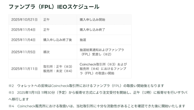 ファンプラ(FPL)IEOでは、販売総数10万口(10億FPL)、公募価格1円/FPL、総調達額10億円が設定されている。応募者が10万人を超えた場合は抽選制に移行し、1人あたり1口(=1万FPL)までに制限される仕組みだ。