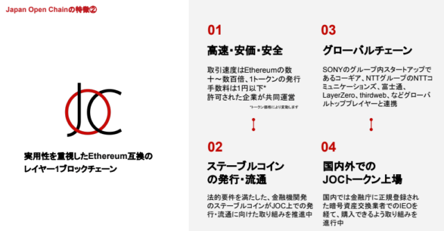 さらにJOCは、金融機関が発行する法規制準拠のステーブルコインをJOC上で発行・流通させる取り組みを推進しています。ステーブルコインは現金決済と比較して取引完了までのスピードが速く、コストパフォーマンスにも優れている点がメリットです。