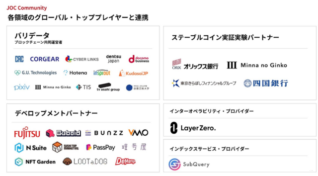 JOCは各領域のグローバル・トッププレイヤーと連携しており、コミュニティは継続的に拡大を続けています。特筆すべきは、JOCのコミュニティでは、前述したステーブルコインの実証実験や後述するNFTプロジェクトに代表されるように、実用的なユースケースを創出する存在として機能している点でしょう。