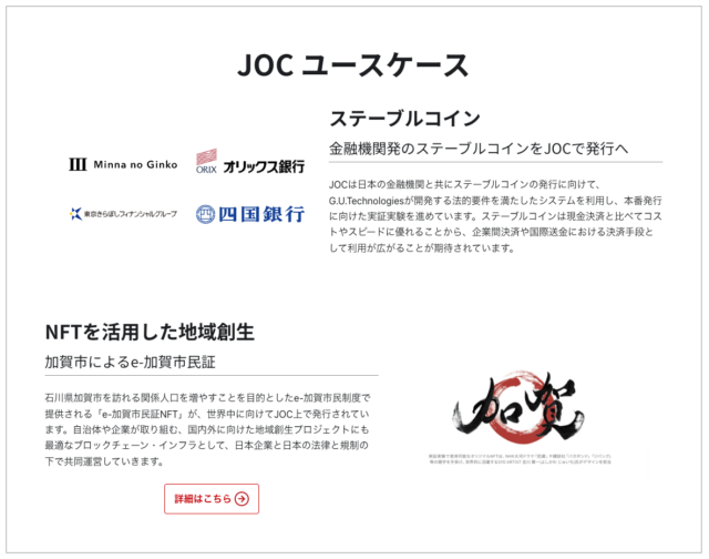 JOCのバリデータでもあるG.U.Technologies株式会社は、2023年6月の改正資金決済法施行によって国内でステーブルコインを発行する法律が整備されたことを受け、国内銀行と連携しステーブルコインの発行・管理システムの構築を進め、JOCが次世代型の金融インフラとして利用されることを目指しています。
