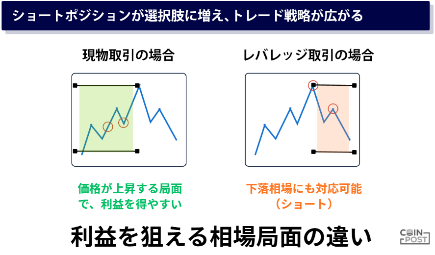 レバレッジ取引は現物を保有せず、価格変動の差額のみを取引する「差金決済」方式です。買い(ロング)だけではなく、売りポジション(ショート)からも取引できるため、下落相場でも収益機会がある一方、ポジション保有中は資金調達手数料等のコストが発生するため、長期保有には適していません。