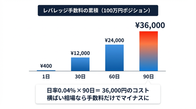 具体例:100万円のポジションを3か月保有 → 100万円 × 0.04% × 90日 = 36,000円