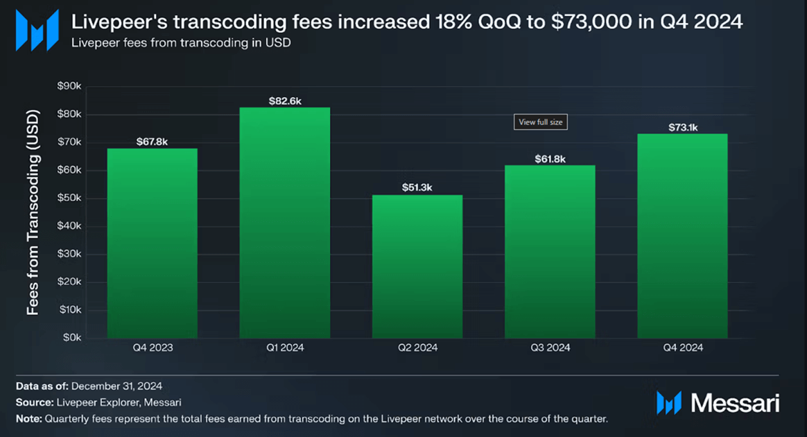 ライブピアは、ブロックチェーン技術を活用した分散型動画配信プラットフォームとして、効率的なトランスコーディング処理とデータ配信を実現しています。従来型クラウドサービスと比較して、ライブピアはライブストリーミングトランスコーディングコストを最大80%削減できるとされ、実際に2024年第4四半期では約3500万分の動画処理が行われ、前年比15%増を記録。トランスコーディング料金は暗号資産(ETHやステーブルコイン)で支払われ、同四半期の総額は約7万3000ドル(前四半期比18%増)に上ると報告されています。