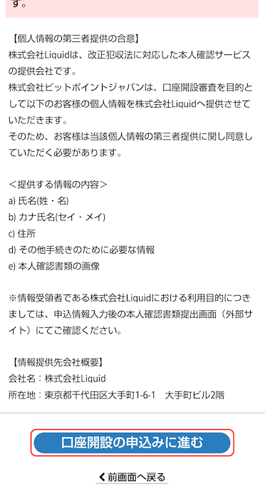 本人確認書類の提出に伴い個人情報保持に関する文面が表示され、下の「同意して進む」をタップし、株式会社Liquidの本人認証サービスへ移動します。プライバシーポリシーや利用規約が表示されるので、下にスクロールして「同意して次へ進む」をタップします。(※外国籍の方は在留カード)