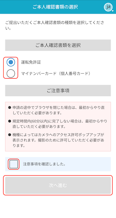 本人確認書類を運転免許証かマイナンバーカードの2つから選択し、注意事項を確認して「次へ進む」をタップします。