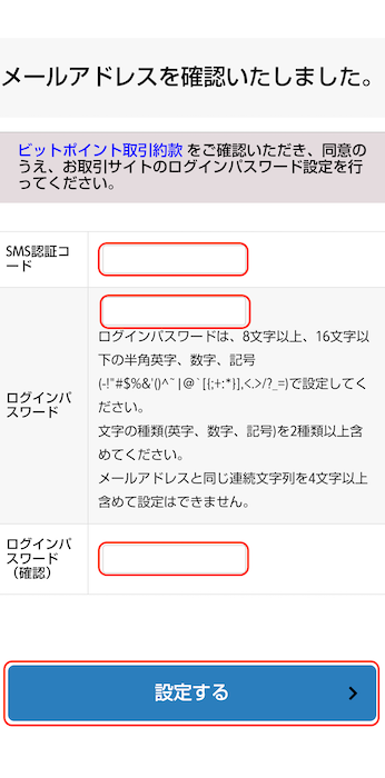 先ほど登録した電話番号宛にSMSが届くので届いたSMS認証コードを入力してパスワードを設定します。パスワードの確認が終わったら「設定する」をタップします。