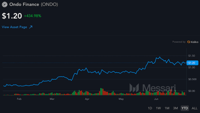 まず1つ目はONDOの価格が上昇していることです。ONDOは24年1月に流通が開始され、0.2ドル付近の初値がつきました。その後にコインベースなどで取引が開始しており、24年6月時点で1.2ドルまで価格が上昇しています。