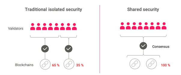 通常PoW(Proof-of-Work)およびPoS(Proof-of-Stake)を採用したブロックチェーンでは、その性質上、セキュリティ確保(=コンセンサスが破られないようにすること)に膨大なリソース(資源)が費やされます。PoWの場合、計算処理を行うためのコンピュータパワーが、PoSの場合ステークする資産が、リソースとして必要になりますが、これらのリソースは有限であるため、異なるブロックチェーン同士がこのリソースを奪い合う状況が生じます。
