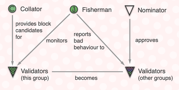 ポルカドットのセキュリティは、バリデーター(検証者/Validator)、コレーター(照合者/Collator)、ノミネーター(指名者/Nominator)、およびフィッシャーマン(漁師/Fisherman)と呼ばれる4種の参加者によって守られています。