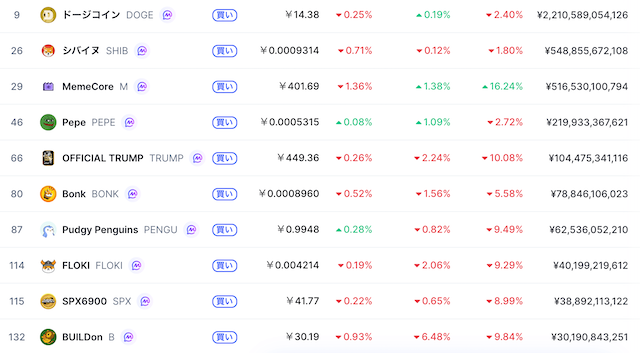 ミームコイン分野TOP銘柄 出典:コインマーケットキャップ(2026年4月時点)