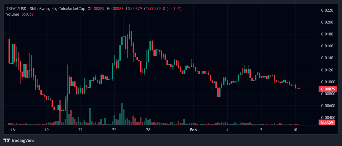 TREATの価格は、エコシステムの展開やコミュニティへのエアドロップ、さらにSHIB全体のニュースによって変動してきました。以下は主な価格イベントです。
