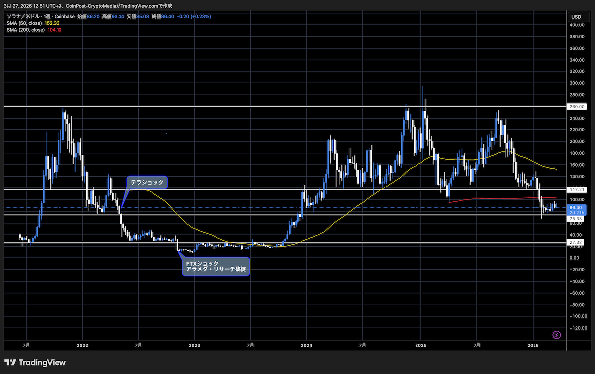 FTXとその関連会社AlamedaはSOLを大量保有・支援していました。2022年11月のFTX破綻によりSOLは約260ドルのATHから10ドル台へ急落し、「ソラナ終焉論」が広まりました。しかし2023年にはFTX関連のSOL売却が進む一方でエコシステムの自立が進み、ミームコインブームも重なって価格・開発活動ともに復活。FTX危機からの復活はソラナのエコシステムの底堅さを証明した出来事と評価されています。